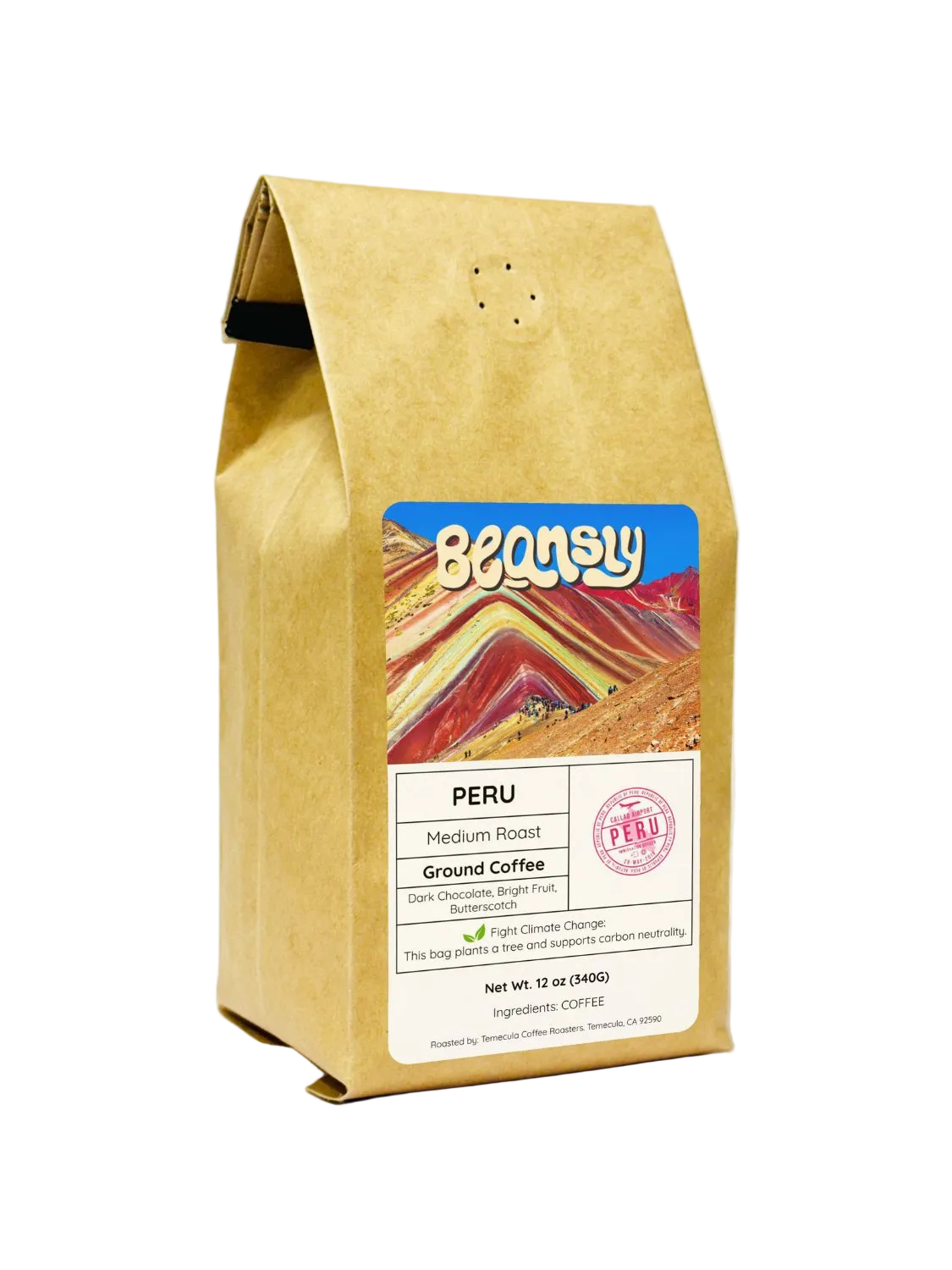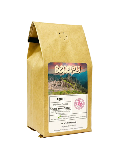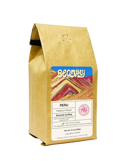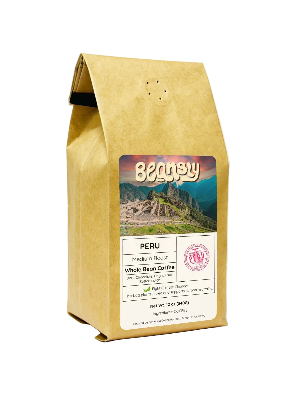 Discover the golden slopes of Peru in every cup. This medium roast single-origin coffee from Jaén and Cajamarca delivers rich dark chocolate and almond notes with a heavy, velvety body and mellow acidity.